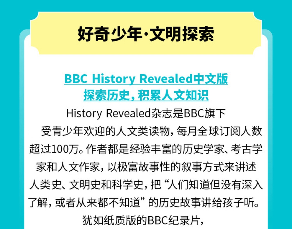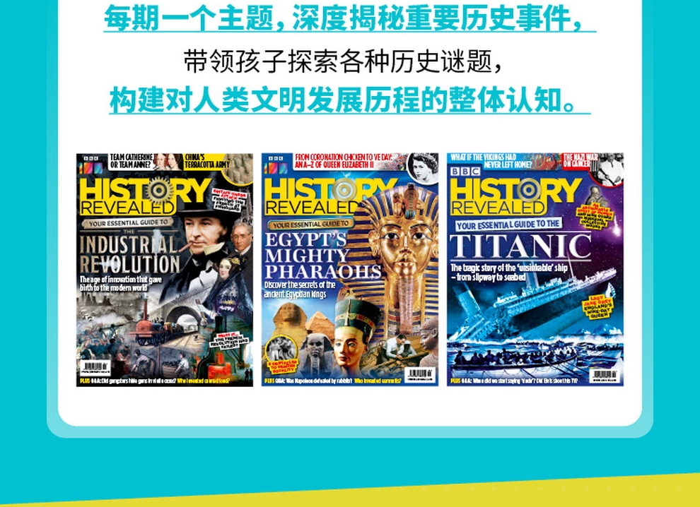 BBC History Revealed中文版:《文明探索》每期一个主题,犹如纸质版的BBC纪录片,以富有故事性的叙事方式来讲述人类史、文明史和科学史,把“人们知道但没有深入了解,或者从来都不知道”的历史故事讲给孩子听。