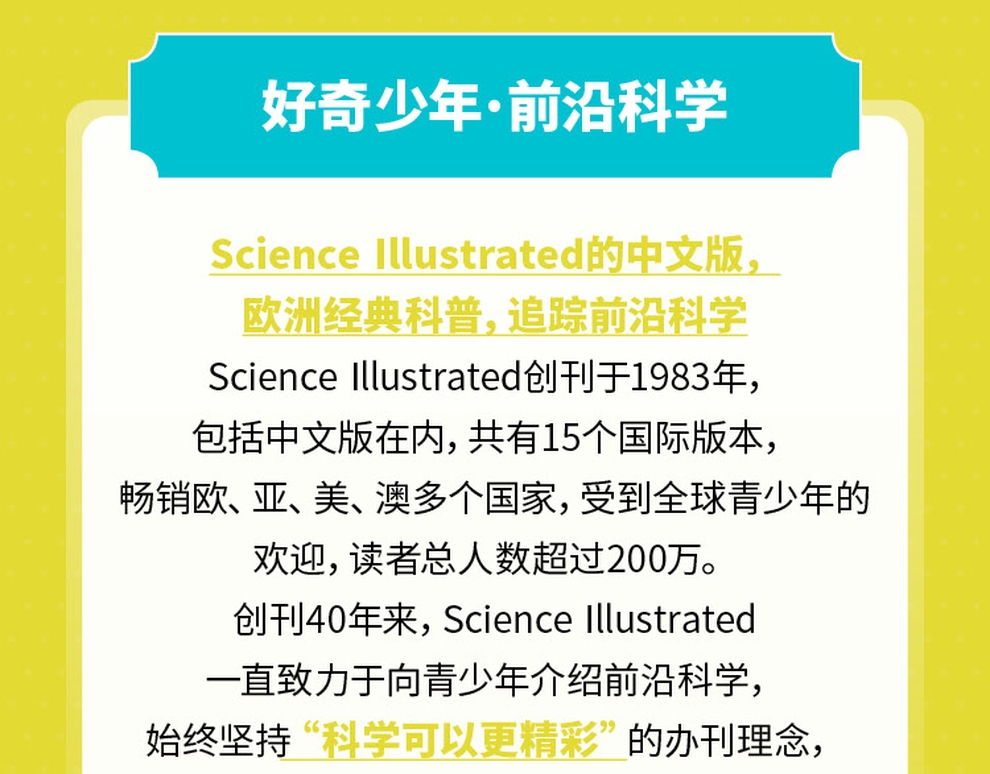 Science Illustrated创刊近40年,畅销15个国家,全球订阅人数超过200万,好奇少年(原奇点科学) 获得Science Illustrated特别授权,在中国大陆地区出版Science Illustrated中文版,把世界上重要的前沿科学发现、研究成果、科技进展介绍给中国青少年。