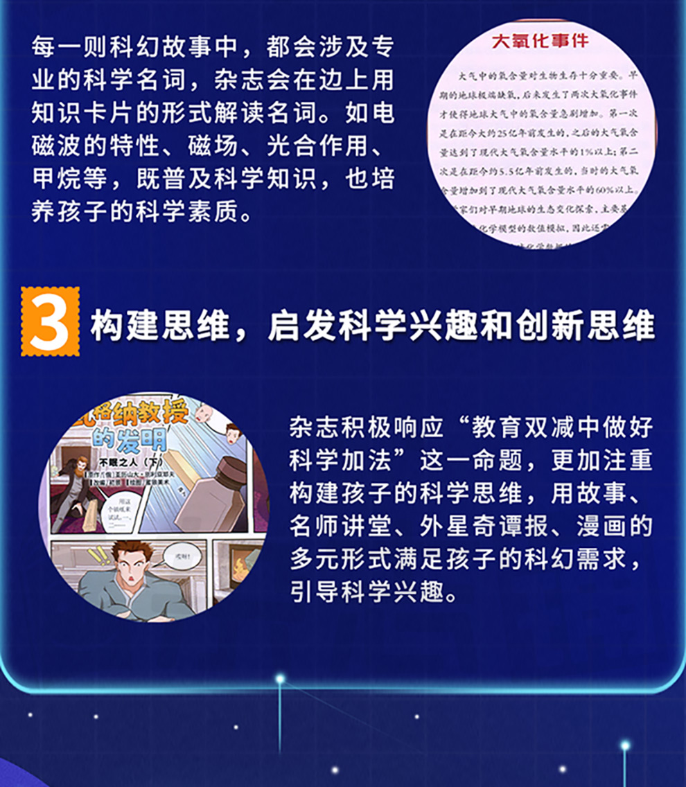 杂志设置了多个栏目,以科幻故事为主,让孩子放飞想象力,畅游在科学世界,满足孩子的科幻需求。