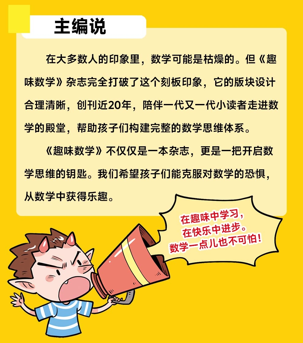《趣味数学》是一本图文并茂的少儿数学学习类期刊,以8-12岁的青少年为主要读者对象。内容涉及小学数学的多个领域,包括课堂常见题型、数学趣味知识、数学魔术、数学游戏、数学家励志故事等,引导孩子走进数学爱上数学。