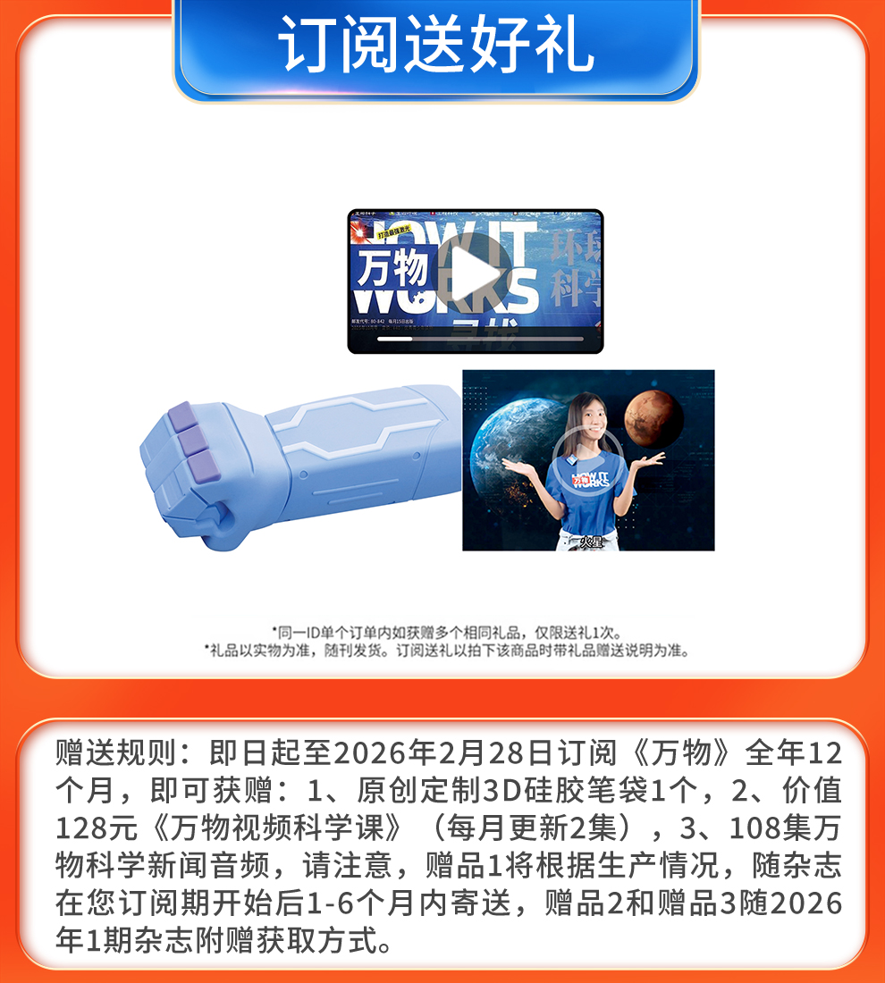 《万物》诞生于孩子对世界的好奇之中,主要解决“如何守护孩子的好奇心、培养创造力?”的问题。杂志源自青少年科普百科杂志《How it works》,由科学团队+3维制图团队联手打造,内容横跨七大学科,用图文并茂的方式,将复杂的科学化繁为简,讲述万物背后运转的科学原理,完成孩子对世界的好奇,以及全家大小的求知渴望。
