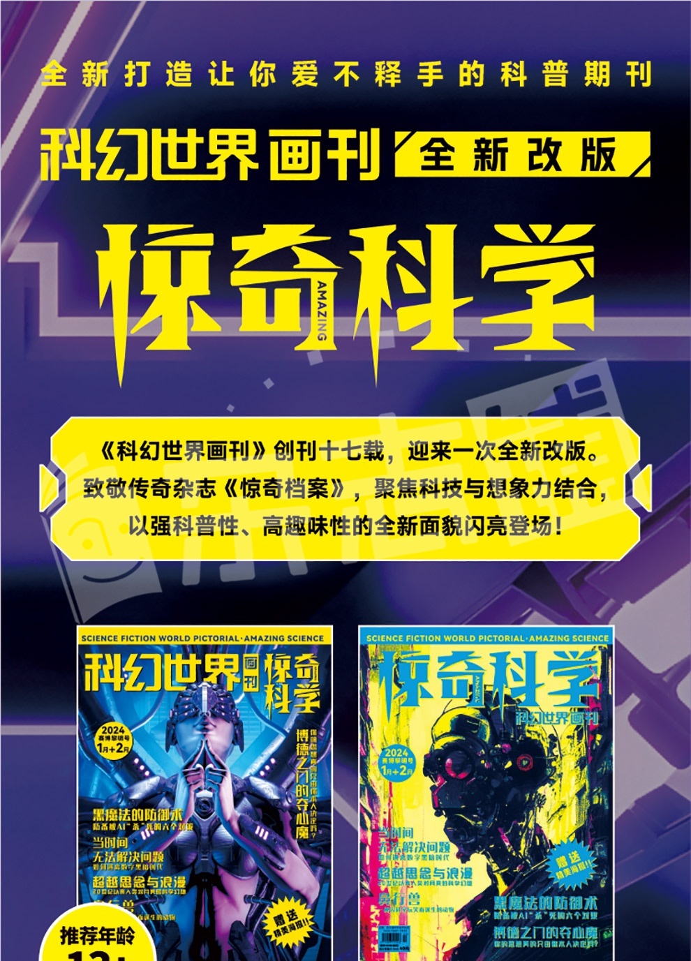 《科幻世界画刊·惊奇科学》是科幻世界全新打造的青少年科普期刊,全彩印刷,图文并茂,以“新鲜有趣,炫酷惊奇,深度系统”为特色,邀请国内外顶级科学家、科普大V加盟,将科幻文化、前沿科技、远古生命、自然地理、文明考古等融为一体,“科幻入,科普出”,以充满想象力和惊奇感的科普图文、极具前瞻性和未来感的前沿思考,带来信息碎片化时代难以提供的系统性科学知识,激发青少年想象力、好奇心和探求欲,培养其深度阅读的专注力和跨界思考的创新力;同时,通过揭秘当代科学家和科学研究实况,传播当代科学家精神,在现代全媒体娱乐环境下激活青少年对科学科普事业的兴趣。
