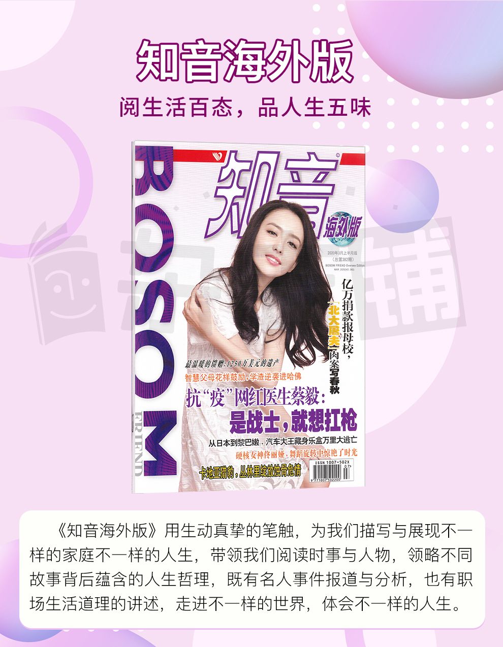《知音•海外版》创刊于1996年8月,月刊。《知音•海外版》秉承《知音》“人情美、人性美”办刊宗旨,强化国际特色,讲述异域人生,荟萃世界美文,反映人们对于精神情感美好境界的追求,以其品味高雅、清新隽永的风格享誉海内外。