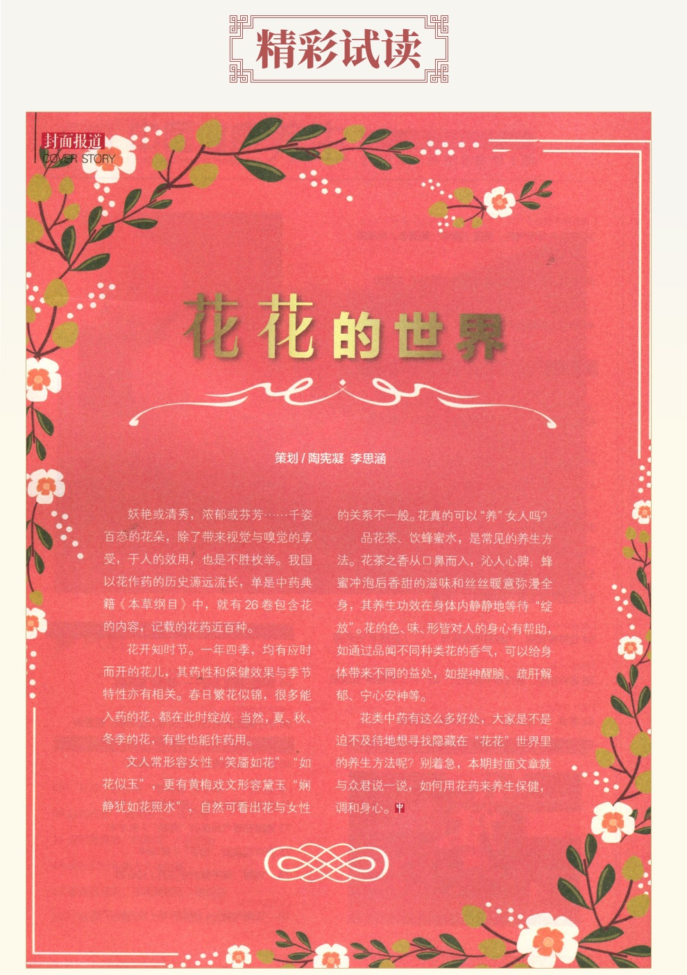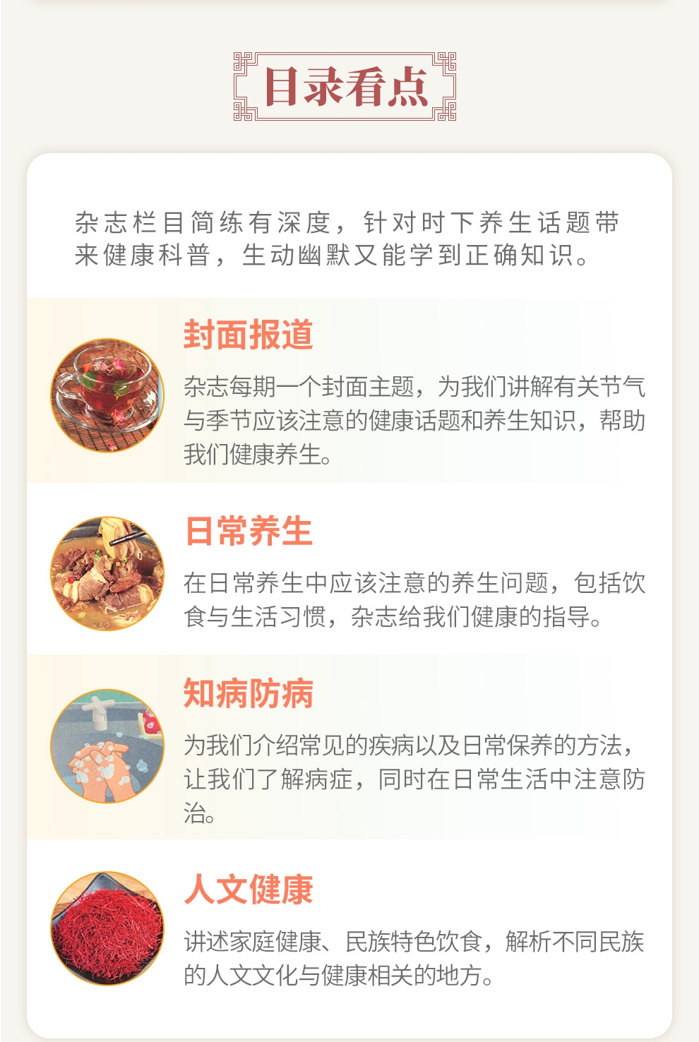 《中医健康养生》除了每期新闻热点类“封面报道”重头栏目以及不定期特别策划外,内容分为三大版块:养生汇、治未病、大健康